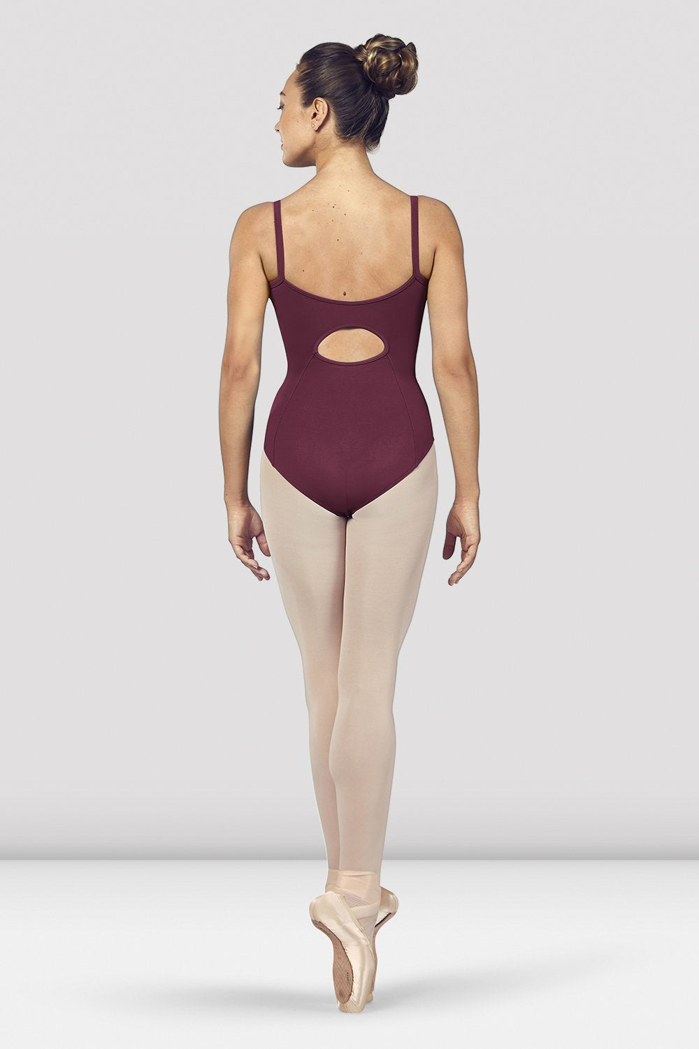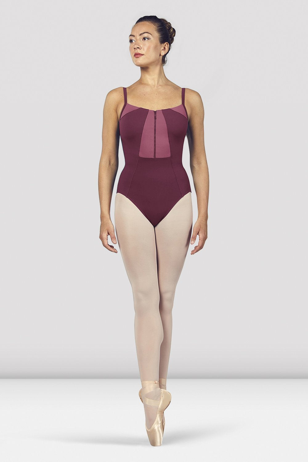 This elegant dance staple features a functional zipper front that fastens half way down the bodice. At the back, camisole straps meet to create a scoop neckline, further refined by a keyhole cut out. A trio of contrasting Color block panels further flatter and add to the modernity of the piece.